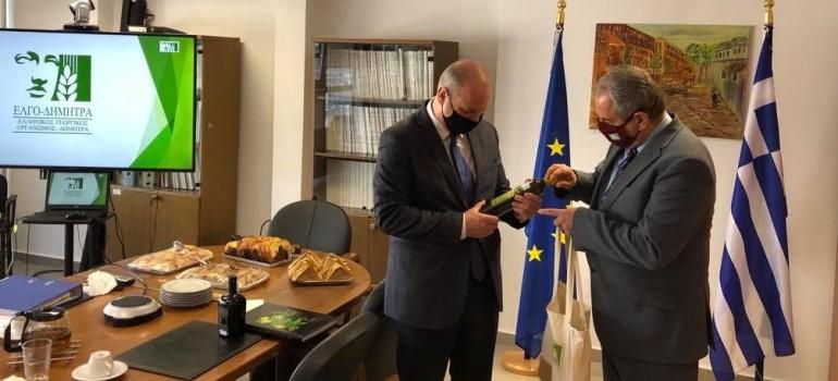 Την Κεντρική Υπηρεσία του ΕΛΓΟ - ΔΗΜΗΤΡΑ επισκέφθηκε χθες ο Υφυπουργός Αγροτικής Ανάπτυξης και Τροφίμων κ. Γιάννης Οικονόμου με τους συνεργάτες του. Αφού παρουσιάστηκαν στον Υφυπουργό οι δραστηριότητες του Οργανισμού ακολούθησε συζήτηση για τις σημαντικές προτεραιότητες που έχει θέσει η Διοίκηση, όπως η διάχυση των αποτελεσμάτων της έρευνας στα παραγωγικά συστήματα, τους μηχανισμούς υποστήριξης και τις δομές εκπαίδευσης και κατάρτισης που αποτελούν αιχμή του δόρατος της αναπτυξιακής πολιτικής του ΥΠΑΑΤ.