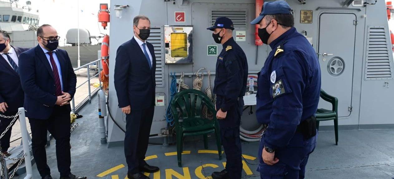 Στη συνέχεια επισκέφθηκε το υπερσύγχρονο περιπολικό του Λιμενικού Σώματος «Γεώργιος Κωτούλας». Έδωσε συγχαρητήρια στον υποπλοίαρχο Γαβριήλ Καλφόπουλο και στους άνδρες του περιπολικού για το διπλό έργο που επιτελούν (εθνικό και ανθρωπιστικό), ενώ επισκέφθηκε και την κανονιοφόρο «Ναύμαχο».
