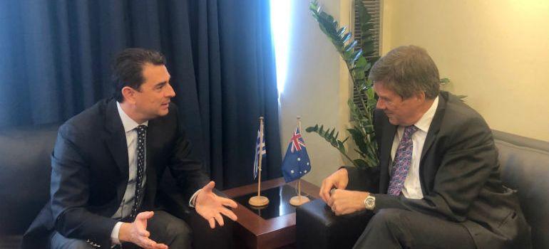 Για τις προοπτικές ανάπτυξης των οικονομικών και εμπορικών σχέσεων Ελλάδας - Αυστραλίας, με επίκεντρο τον αγροτικό τομέα, συζήτησαν κατά τη συνάντηση τους την Τρίτη (3/9/2019) ο Υφυπουργός Αγροτικής Ανάπτυξης και Τροφίμων Κώστας Σκρέκας με τον Επιτετραμμένο της Πρεσβείας της Αυστραλίας στην Αθήνα, Jon Philip.