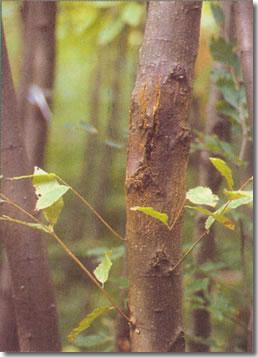 Εισαγωγή Το έλκος της καστανιάς που προκαλεί ο μύκητας Cryphonectria (Endothia) parasitica διαγνώσθηκε για πρώτη φορά στην Ελλάδα στο Πήλιο από τον Δ. Μπίρη το 1963. Αμέσως μετά ίσχυσε απαγορευτική διάταξη του Υπ. Γεωργίας με την οποία ρυθμίστηκε η μετακίνηση έμφλοιας ξυλείας καστανιάς εκτός Ν. Μαγνησίας για τον περιορισμό επέκτασης της ασθένειας. Παρόλα τα μέτρα, η ασθένεια εντοπίσθηκε τα επόμενα χρόνια σε όλες σχεδόν τις περιοχές όπου αναπτύσσεται η καστανιά σε δάση και καστανεώνες. Συμπτώματα 0 μύκητας προσβάλλει το φλοιό. Η προσβολή συνήθως εκδηλώνεται σε σημεία όπου υπάρχει διάρρηξη του φλοιού όπως τομές κλάδευσης, διχάλες, σημεία τριβής κλαδιών, σημεία εμβολιασμού (Εικ. 3 επόμενης σελίδας), φαγώματα εντόμων κλπ. Στο σημείο προσβολής ο φλοιός νεκρώνεται και σε νεαρά δένδρα ή κλαδιά γίνεται πορτοκαλέρυθρος έως καστανός. Μέσα και κάτω από το φλοιό δημιουργούνται λευκοκίτρινες μυκηλιακές πλάκες με μορφή βεντάλιας. Στο κάτω μέρος του έλκους εκπτύσσονται λαίμαργοι βλαστοί (Εικ. 1). 'Οταν η νέκρωση του φλοιού και στη συνέχεια του καμβίου επέρχεται με βραδύ ρυθμό, το δένδρο σχηματίζει νέα κύπαρα φλοιού (επουλωτικό ιστό) με αποτέλεσμα τη διόγκωση του κορμού στο σημείο του έλκους και την κατά μήκος ραγάδωσή του. (Εικ. 1). 'Οταν το έλκος περιβάλλει τον κορμό, τότε το επάνω από αυτό τμήμα του δένδρου νεκρώνεται. Οι ρίζες δεν προσβάλλονται από τον μύκητα, σε αντίθεση με την ασθένεια της μελάνωσης της καστανιάς όπου είδη του γένους Phytophtora προσβάλλουν και νεκρώνουν το ριζικό σύστημα των δένδρων. Στην επιφάνεια του φλοιού εμφανίζονται κιτρινοπορτοκαλόχρωμες διογκώσεις όχι μεγαλύτερες από 2 χιλ., τα πυκνίδια, μέσα στα οποία παράγονται τα αγενή πυκνιδιοσπόρια ενώ κάτω από το φλοιό σχηματίζονται τα περιθήκια, μέσα στα οποία παράγονται τα εγγενή σπόρια, τα ασκοσπόρια. |